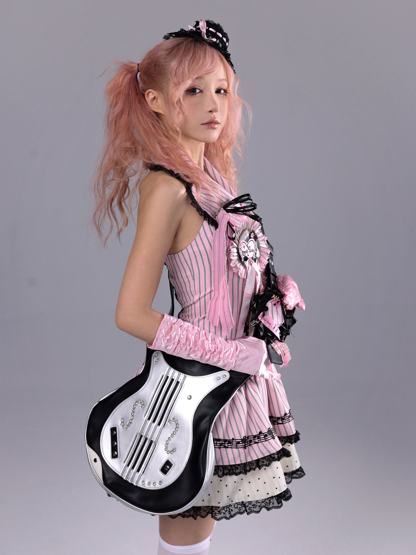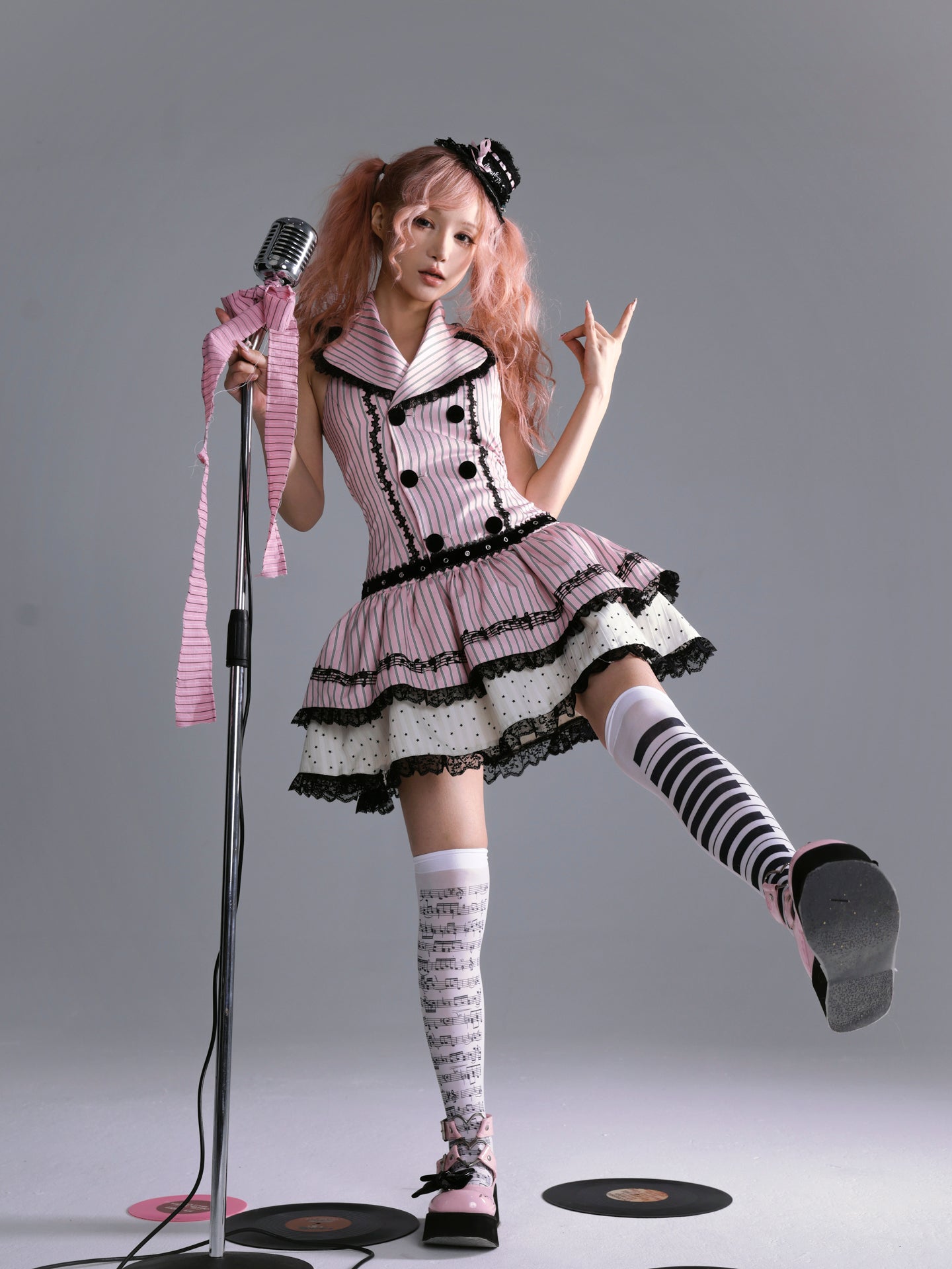 The trajectory of stars and musical notes, street-style striped double-breasted design black sweet performance outfit, blazer collar JSK